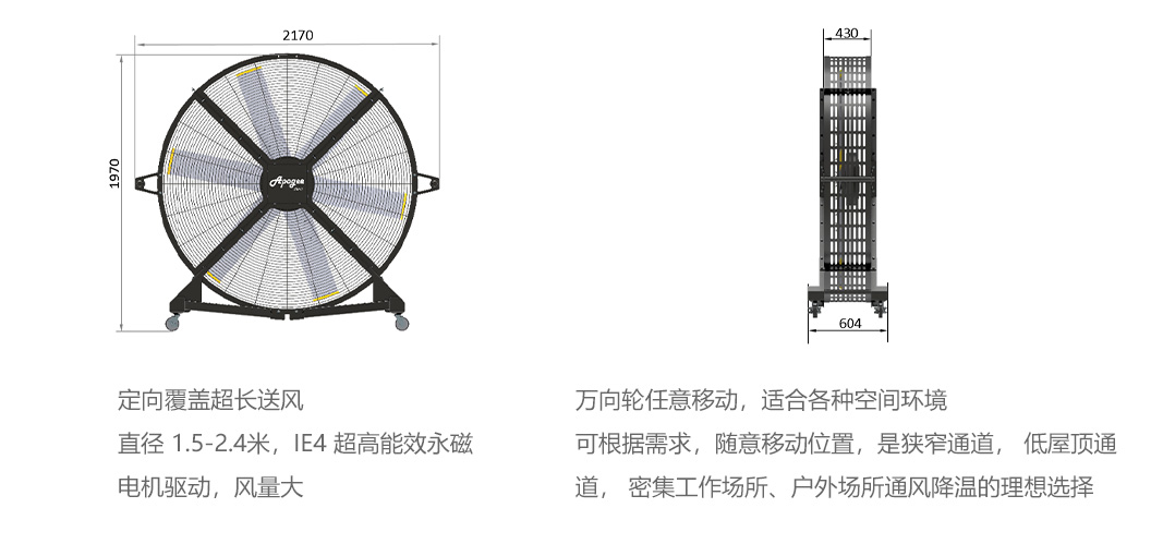 MDM 系列是移動式大風扇, 適用于一些特定場所由于空間受限不能頂部安裝大風量低轉速吊扇, MDM 是一個較為理想的解決方案, 產品適合于狹窄通道, 低屋頂通道, 密集工作場所,或需要特定風量的應用場所。