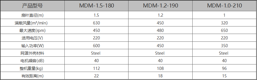 MDM采用永磁無刷電機直接驅動, 電機高效節能, 超高可靠性,扇葉采用高強度鋁鎂合金,流線結構扇葉大化風量及風扇覆蓋距離, 相比低成本鈑金扇葉, 流線結構扇葉有更好出風效率,氣流平穩性,靜音效果。 產品適合室內,室外使用, 方便實用
