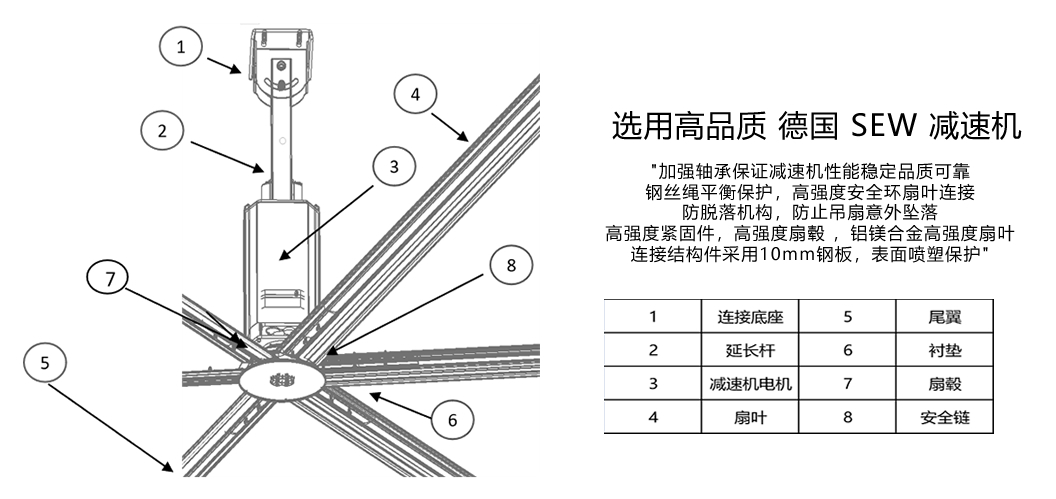 Apogee 減速機(jī)采用德國SEW減速一體機(jī),SKF加強(qiáng)型軸承,進(jìn)口雙油封,低噪音,可靠性高,相比感應(yīng)電機(jī)吊扇,重量減少25KG±,技術(shù)成熟產(chǎn)品,廣受市場好評。